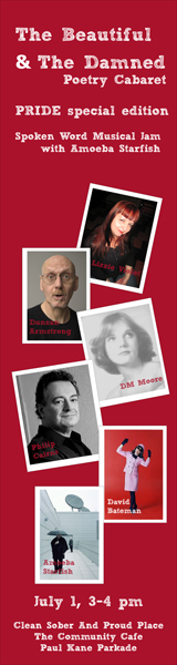 Join us during Pride for a Spoken Work Musical Jam accompanied by Amoeba Starfish at the Clean Sober and Proud Place, The Community Cafe, Paul Kane Parkade (east of Yonge, north side of Welleseley). Map is on their website http://www.torontoplaques.com/Pages_PQR/Paul_Kane_Park.html